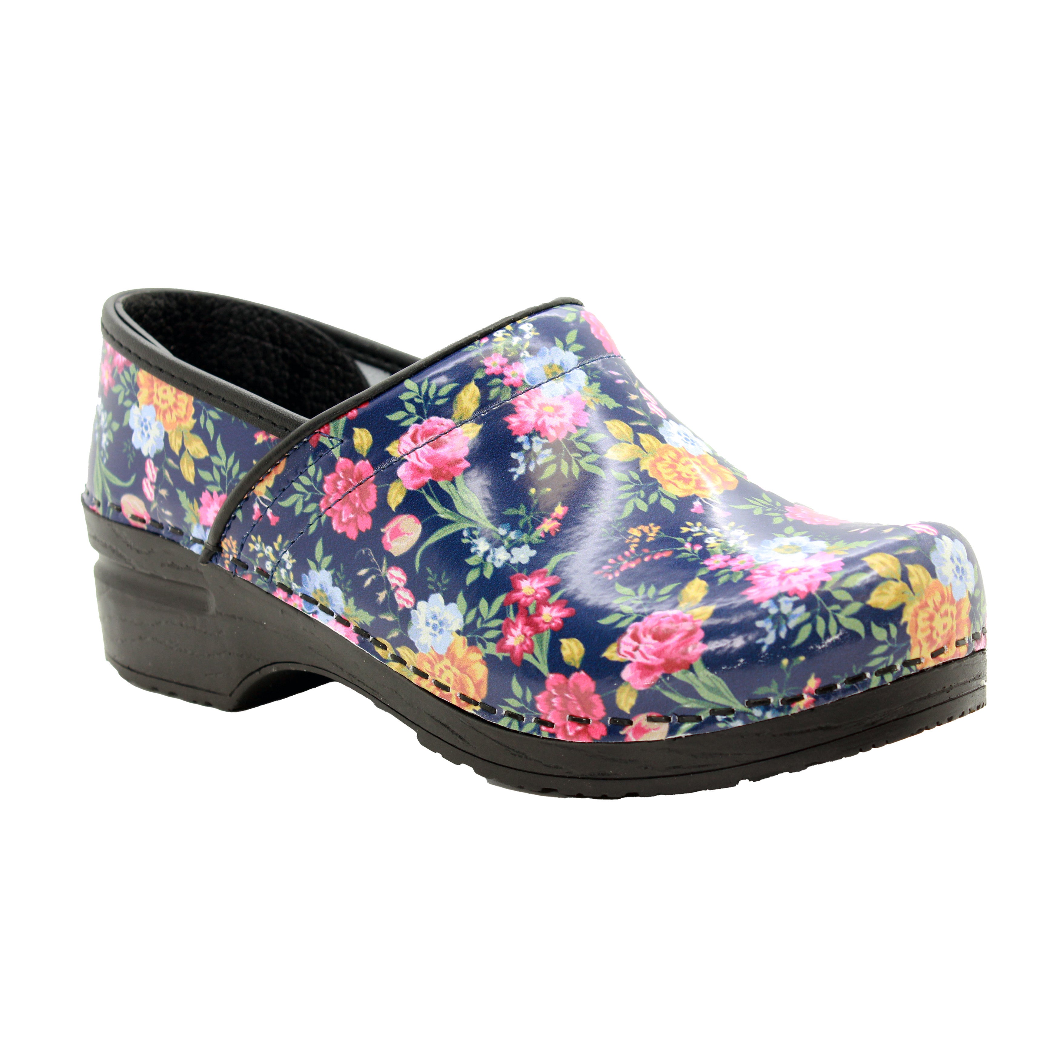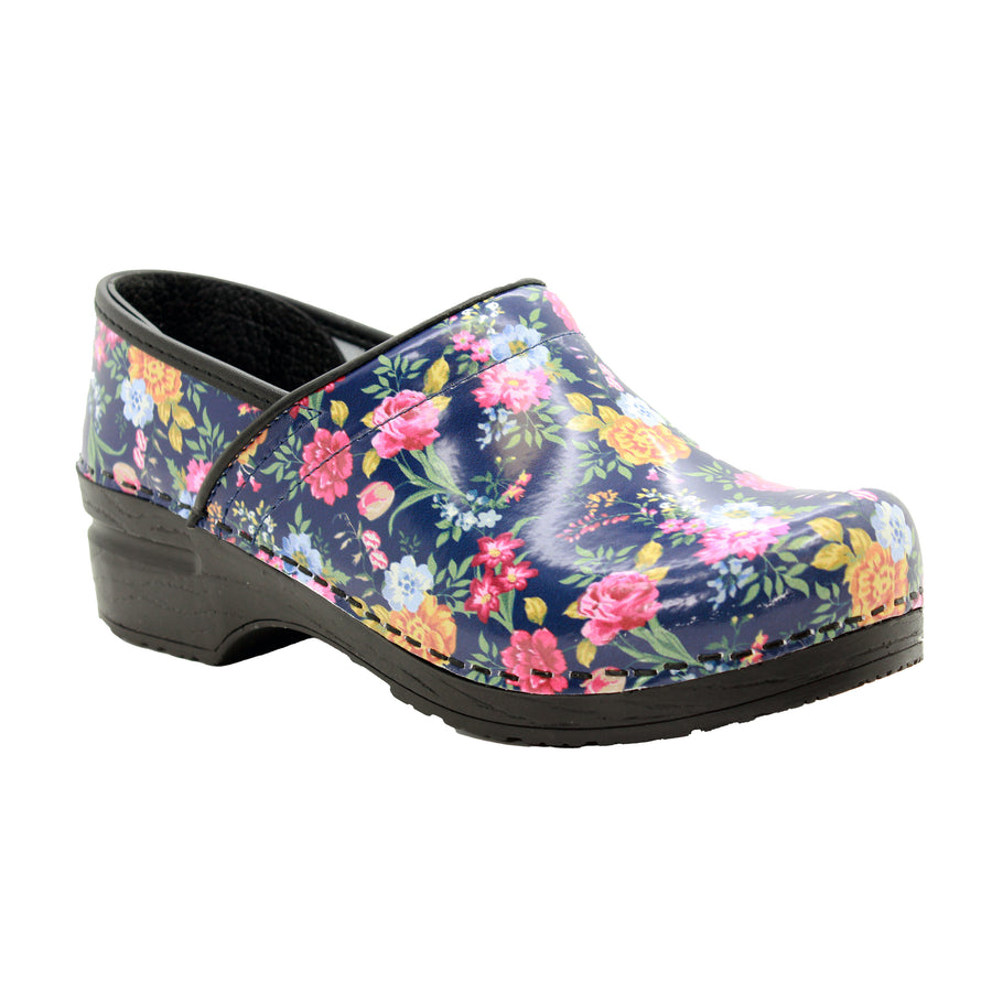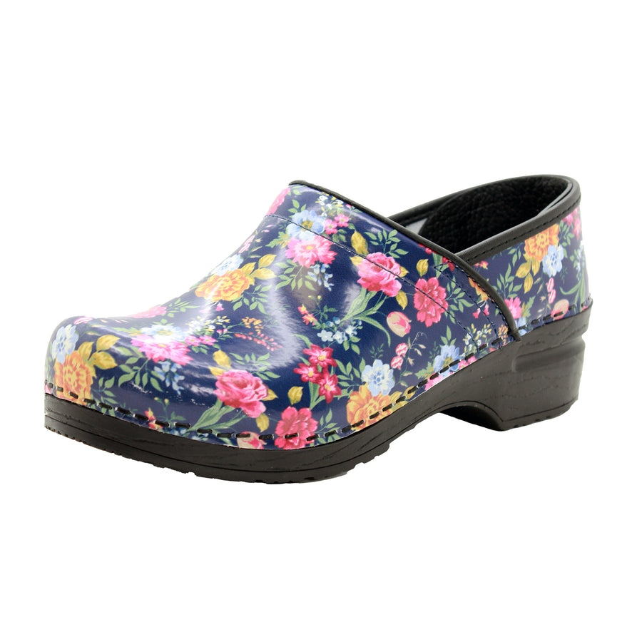 BJORK Professional Astrid leather clogs. Easy cleanable printed leather. Featuring a beautiful graphic of colorful flowers on a dark blue background. The Professional clog is based on the classic yet functional Swedish clog silhouette, hand-made in Europe. It delivers all day comfort, thanks to its softer insole and arch support design. Original BJORK by KLÃGN.